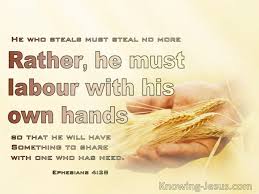 Let the thief no longer steal, but rather let him labor, doing honest work with his own hands, so that he may have something to share with anyone in need.
